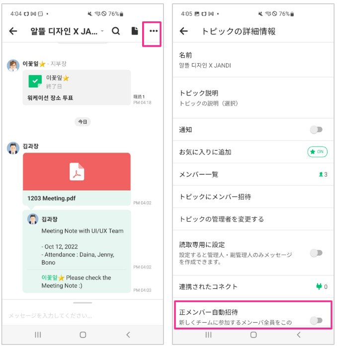<Mobile> トピックトークルーム右上[≡]メニューボタンをタッチし表示される画面で[正メンバー自動招待]メニューを選択します。