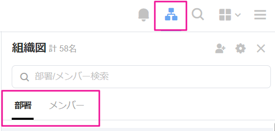 4. 作成した組織図は部署とメンバーで検索できます。 PC/Web JANDIトークルーム側の[組織図]アイコンをクリックすると部署/メンバーで検索できます。