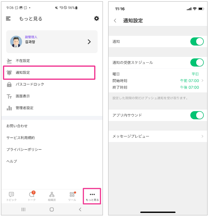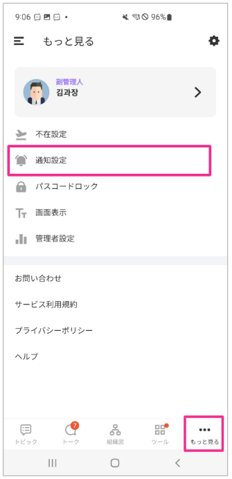1. アプリ上段[☰]ー[通知設定]メニューを選択します。