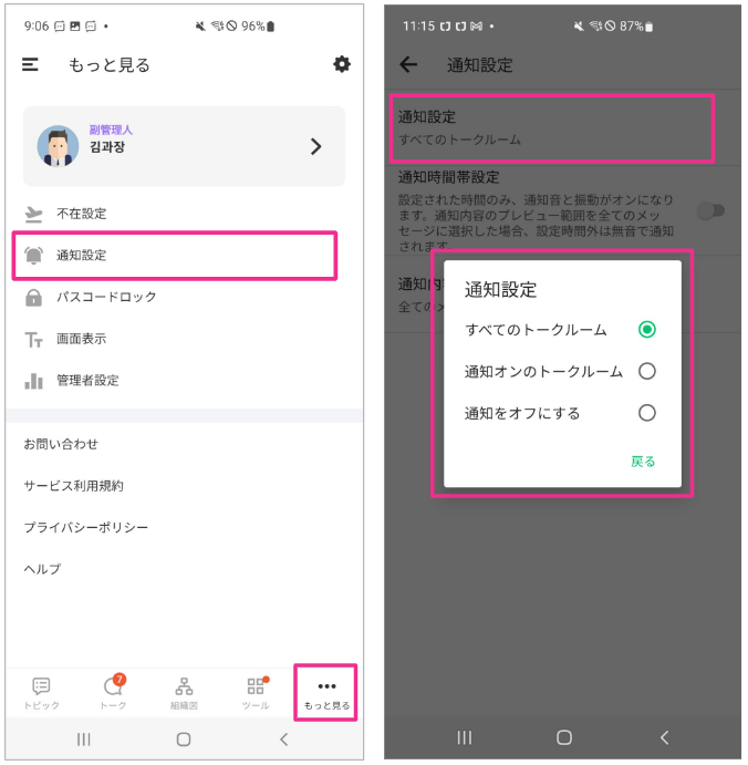 2.[通知]メニューをオンに選択し、詳細通知内容を設定します。 トピック別通知設定もできます。