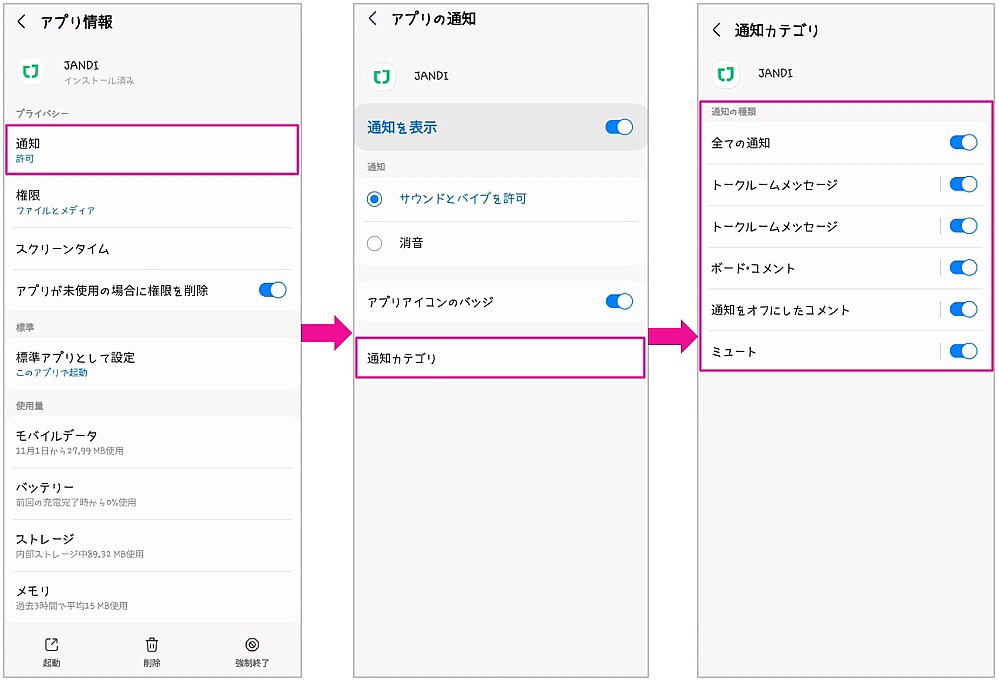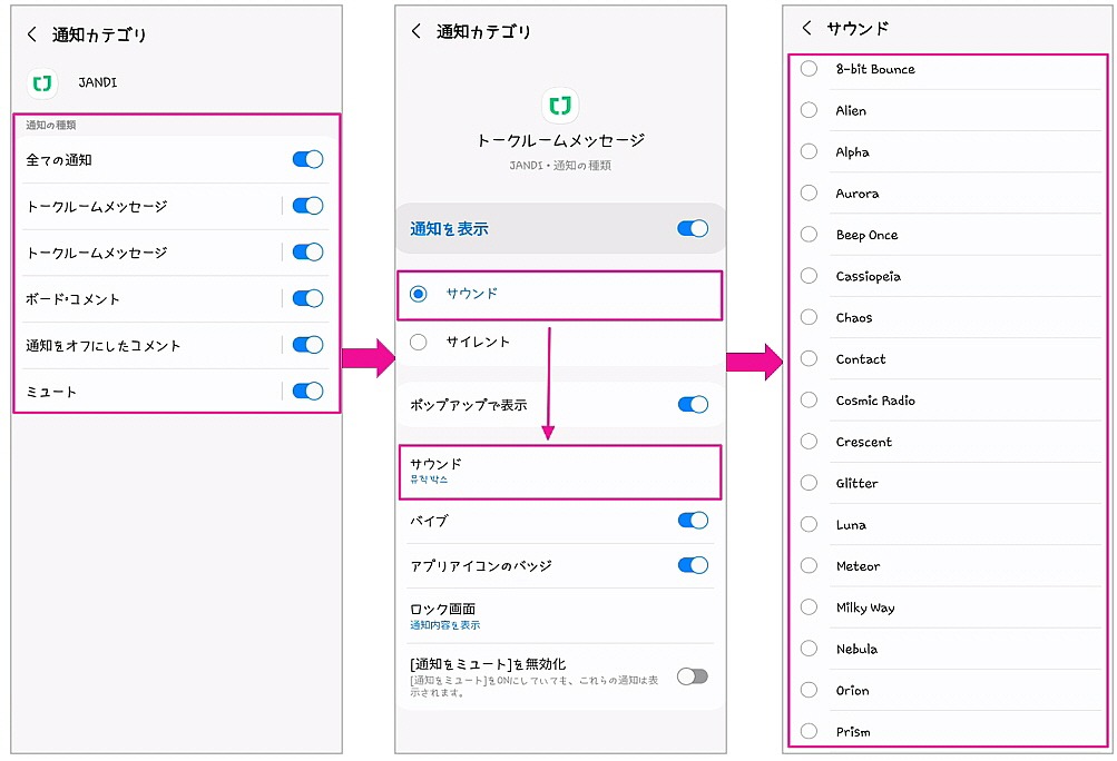[設定] - [アプリ]- [JANDI] - [通知] メニューで設定できます。また、AndroidのOSに搭載されている着信音をJANDIの通知音に設定できます。 [設定] - [音] - [デフォルトの通知音]から選択