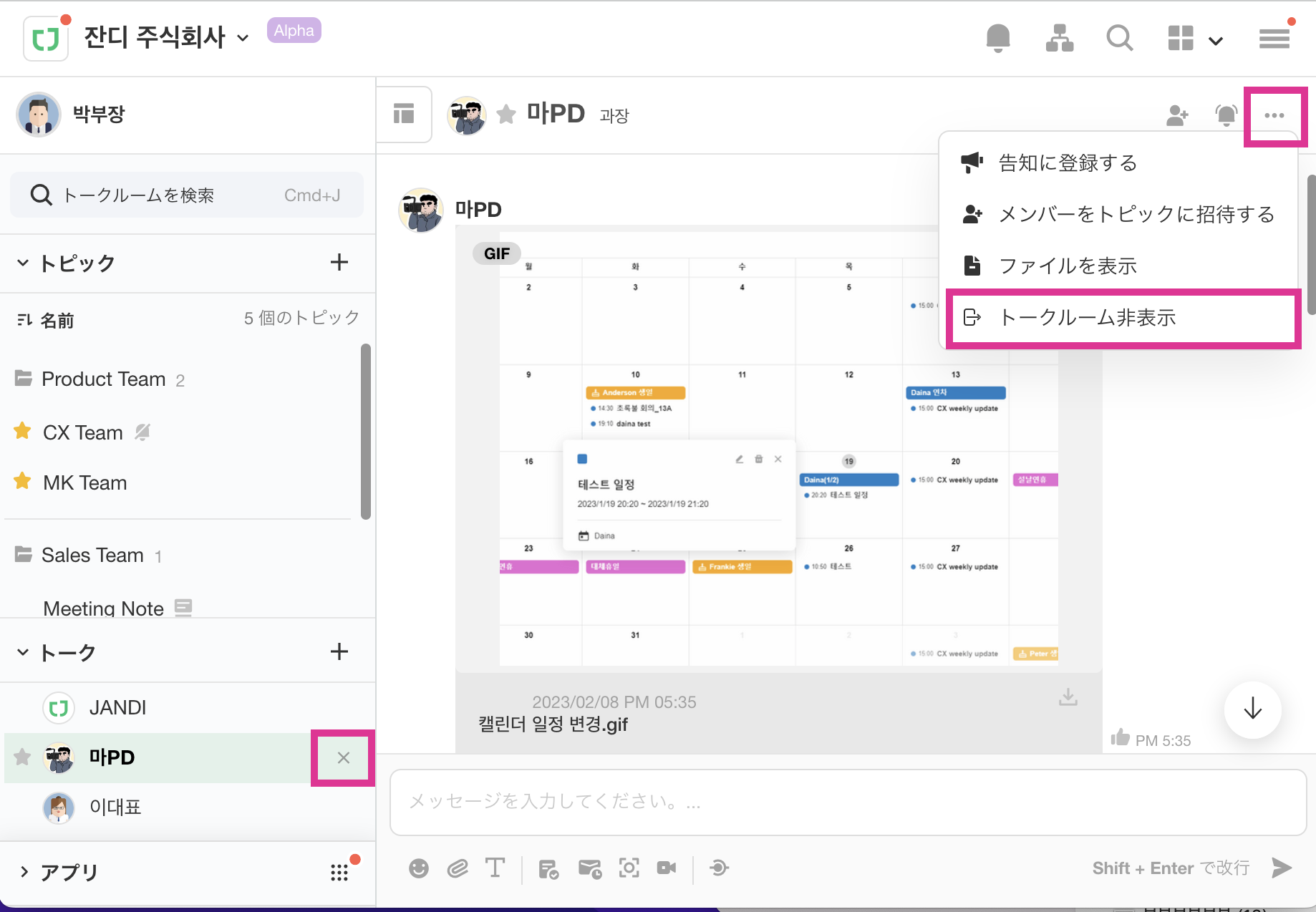 2. 1:1トーク削除すると相手JANDI(自分専用チャット)にも削除された結果が通知されます。