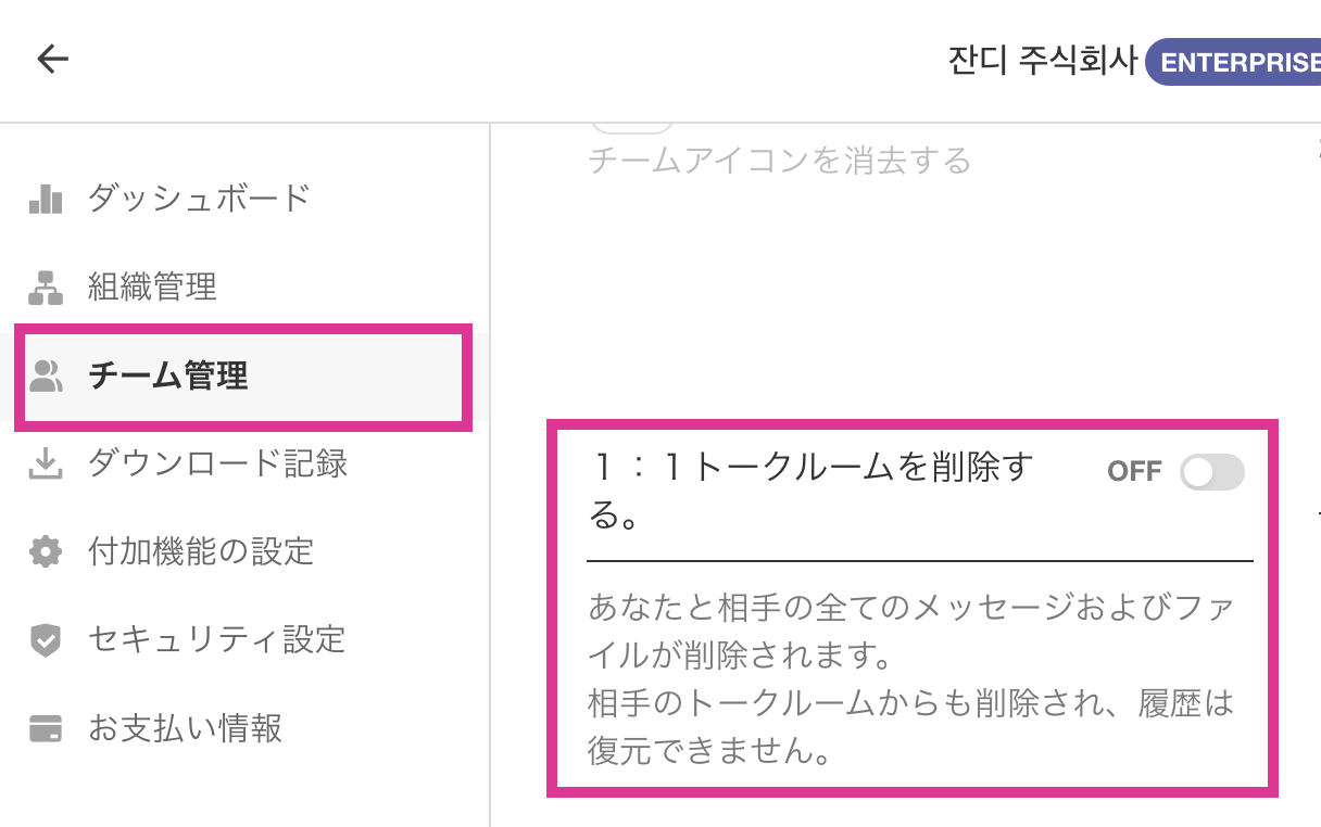 チーム管理者が1:1トーク削除を適用しないとご利用できませんので、ご了承ください。