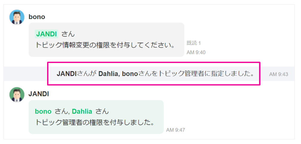 また、トピック管理者が変更されると、どのメンバーが変更したかを確認することができます。
