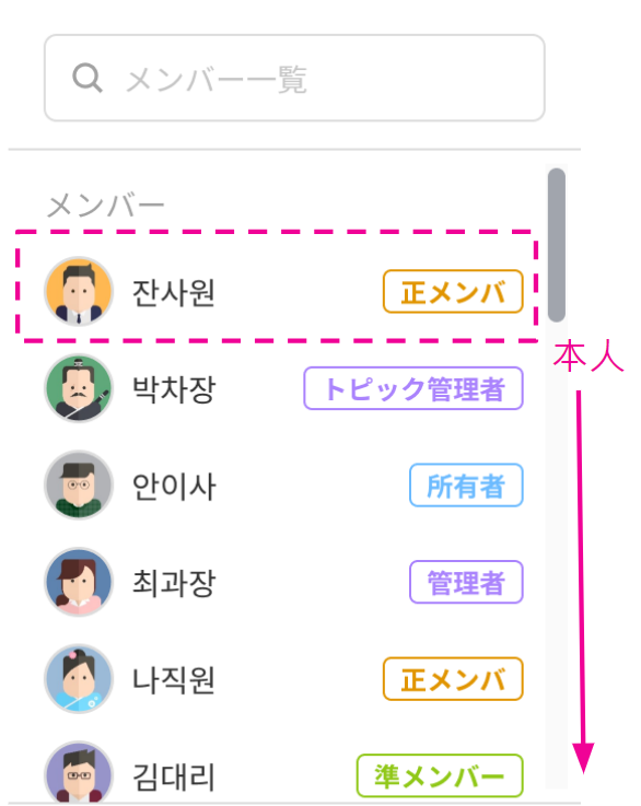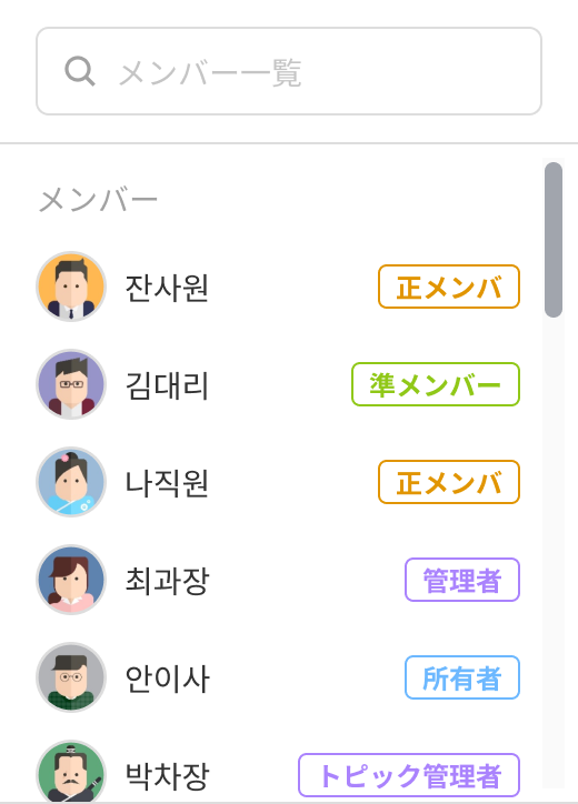 本人 > トピック管理者 > 所有者 > 管理者 > 正メンバー > 準メンバーの順に表示され、同じ権限の場合、名前順に表示されるように改善されました。
