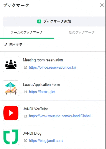 チームのブックマークの並べ替えは管理者のみ変更可能です。