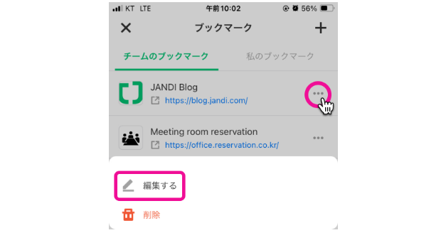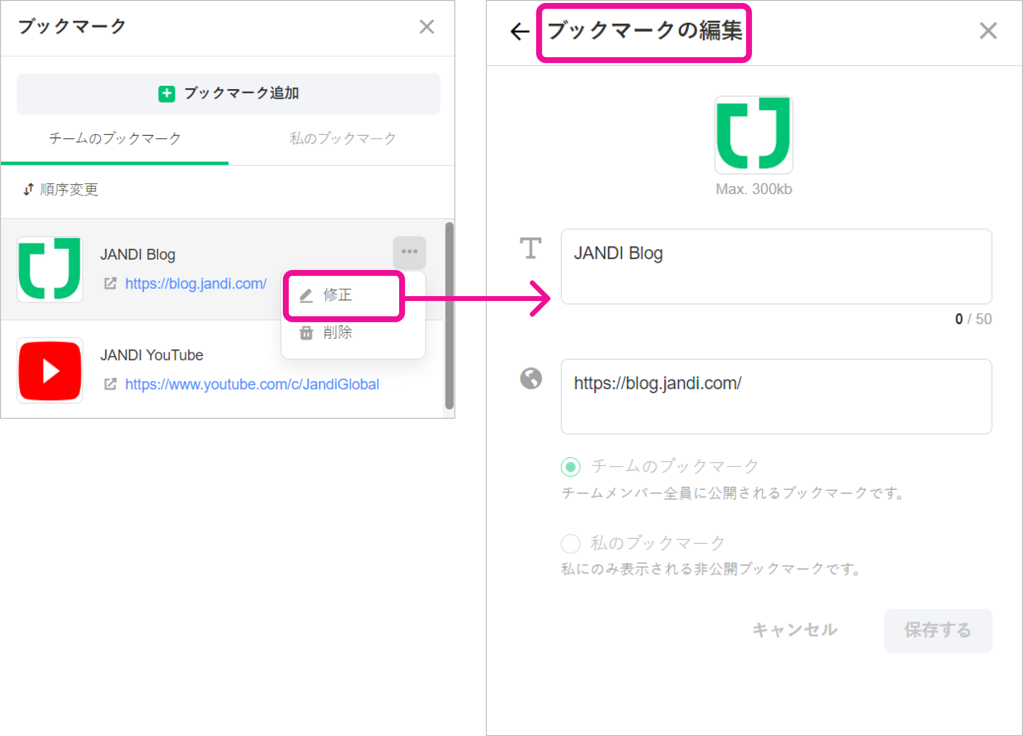 メンバーの修正・削除権限は、チームブックマークの作成設定によって適用されます。