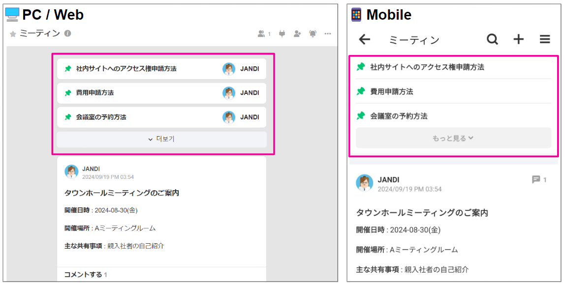 - 重要な投稿を上部に固定して簡単に移動できる機能です。