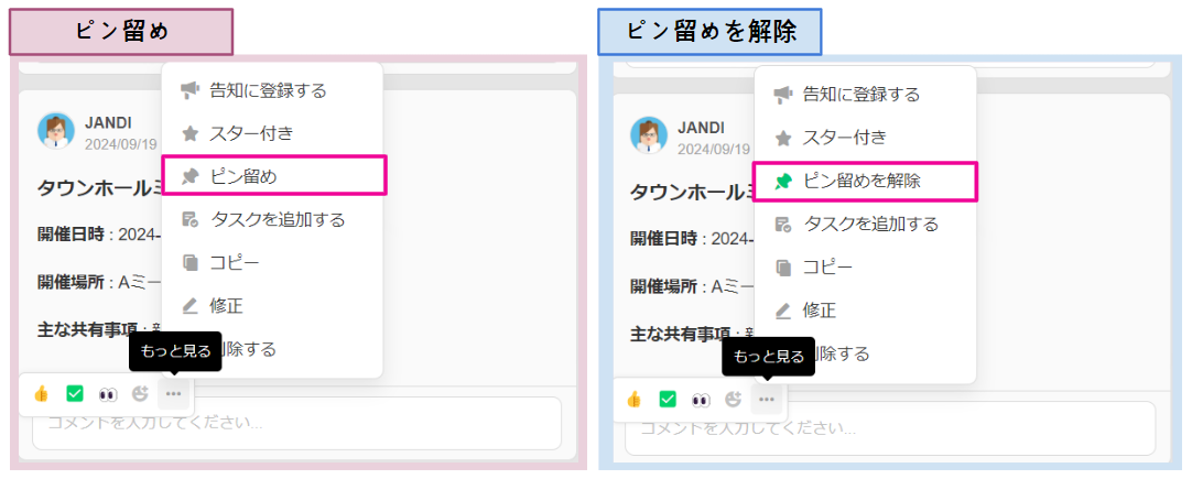 固定が必要な投稿にマウスホバー[...] もっと見る > [投稿を固定/投稿固定を解除]