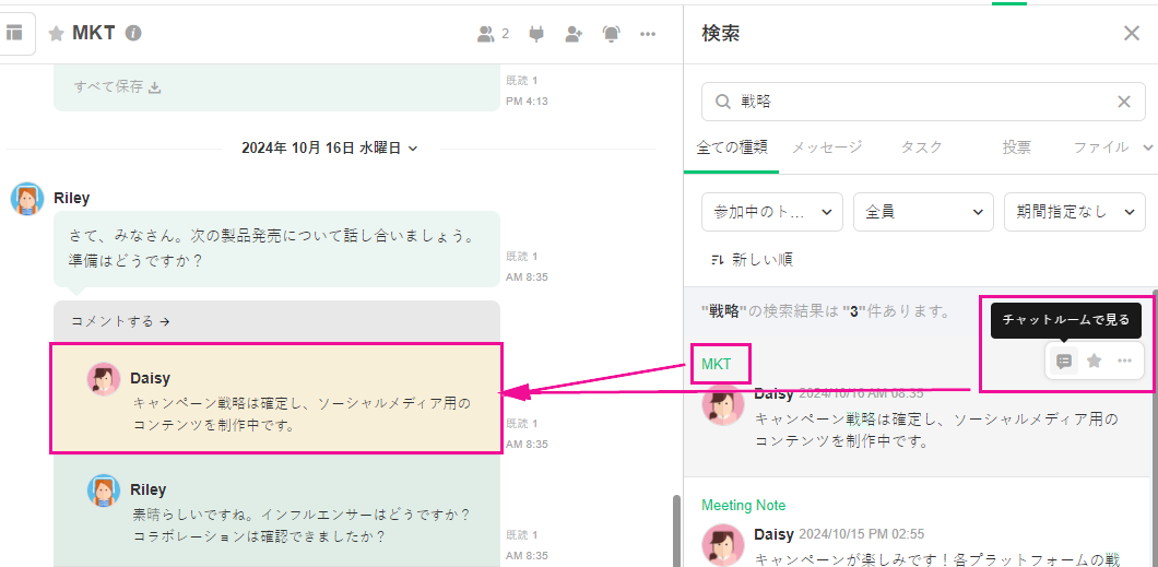 使用方法:メッセージにマウスホバー > [チャットルームで見る] or トークルーム名をクリック