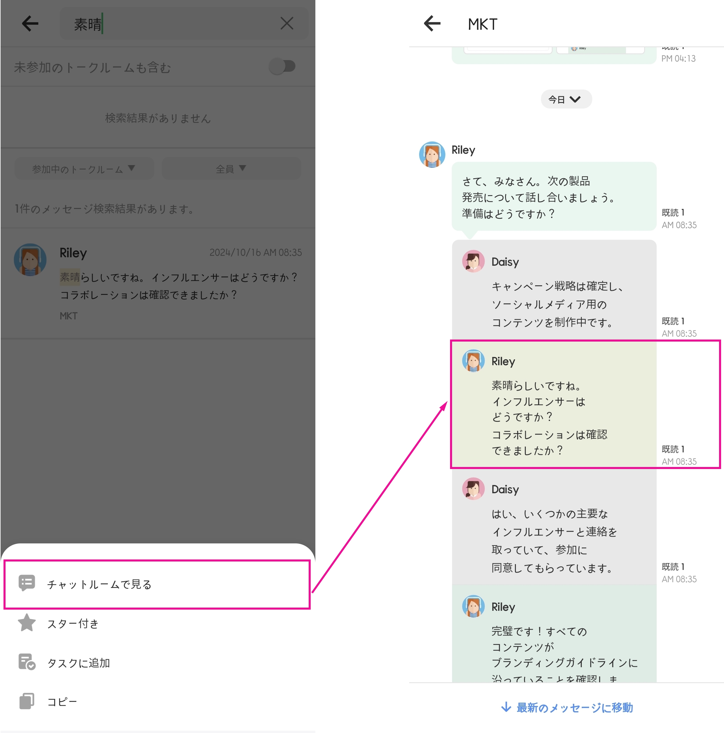 今後は[チャットルームで見る]をクリックすると、そのメッセージがあるトークルームに移動し、会話内容の前後を確認できるようになりました。