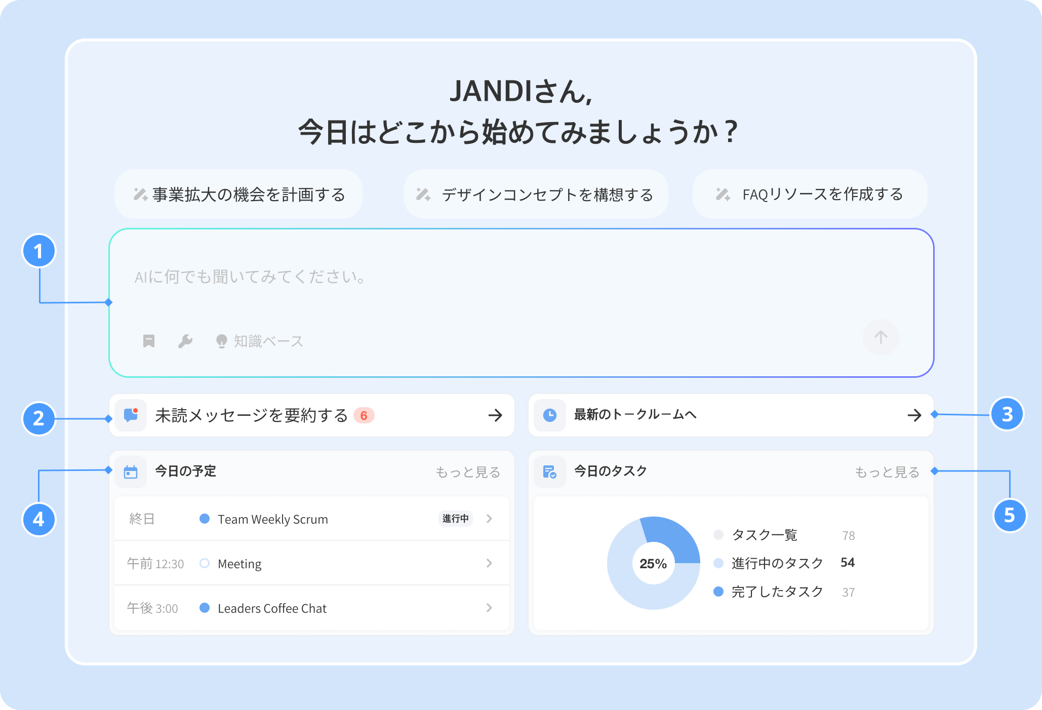 AI が今必要な情報や未読メッセージを要約し、今日の予定まで自動で整理してくれるので、余計な移動なしにすぐに仕事を始められます。