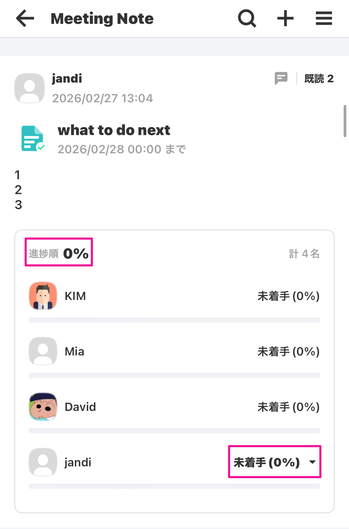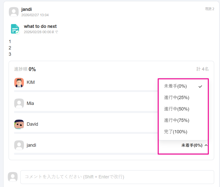 現在の画面を移動することなく、[タスク] で進捗状況の把握やコメントの追加を素早く行うことができます。