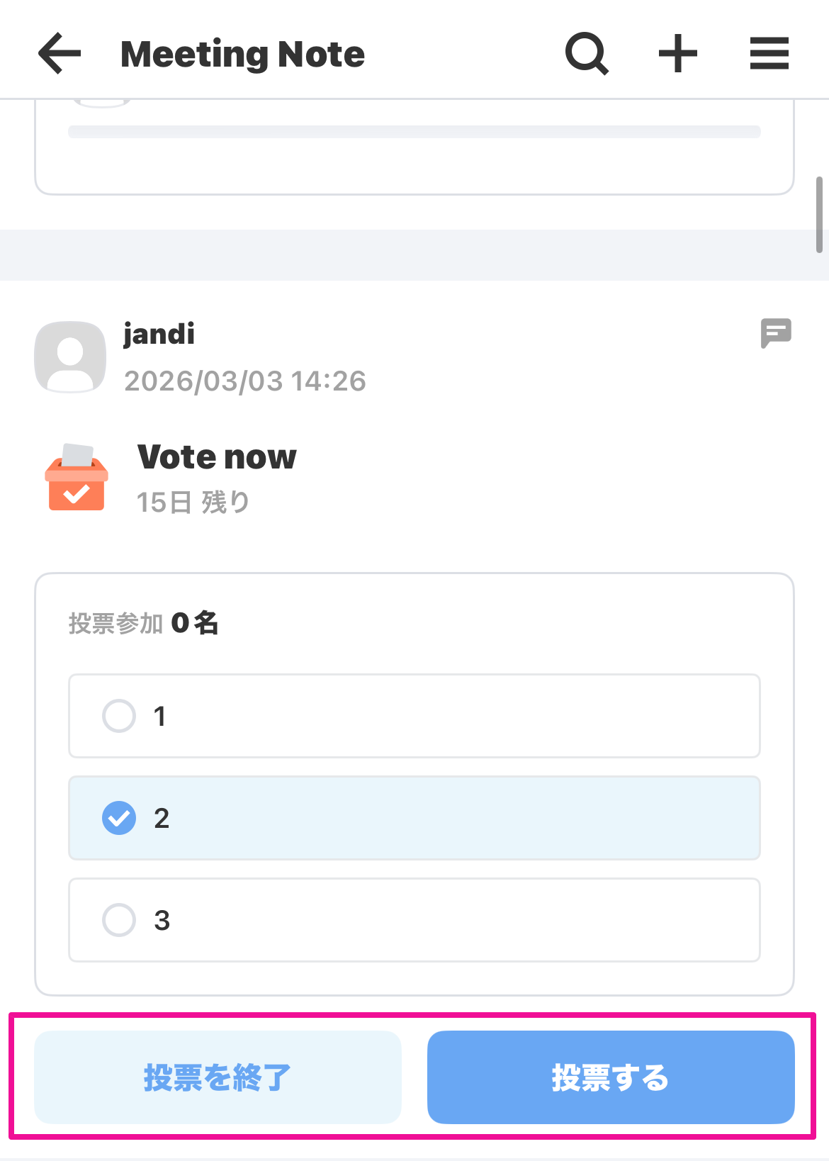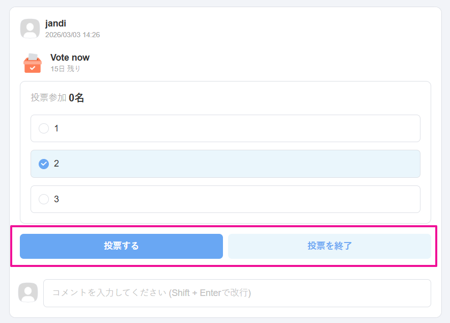 現在の画面を移動することなく、[投票] で素早く投票やコメントの追加、結果の確認を行うことができます。