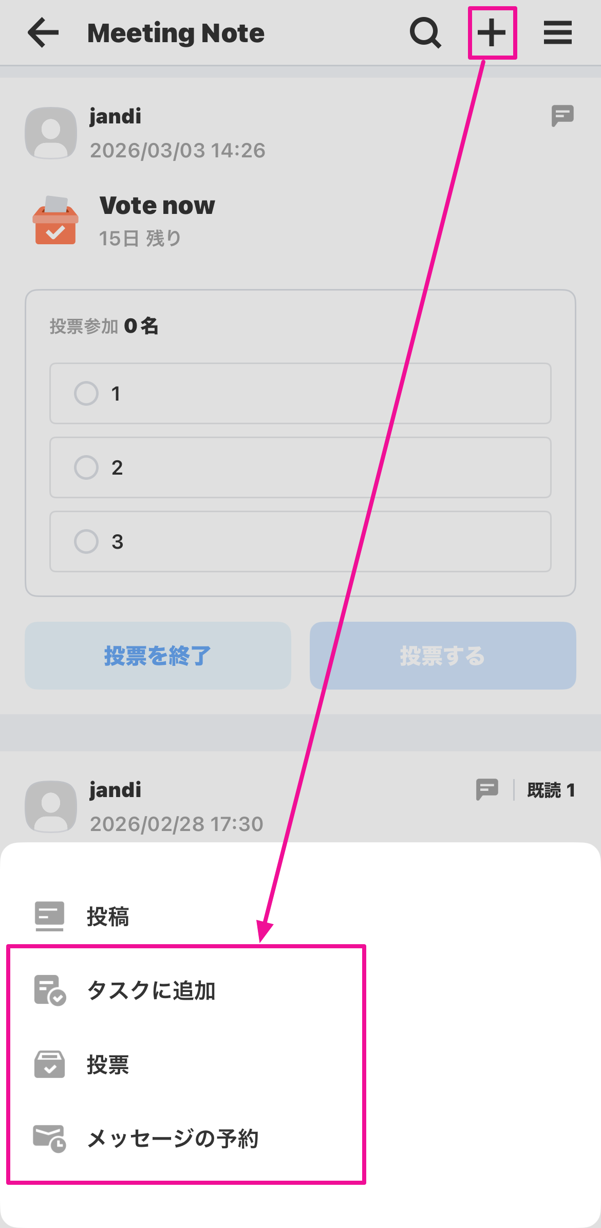 右上の (+) [作成] アイコンをタップすることで、以下の新しい機能をすべてご利用いただけます。