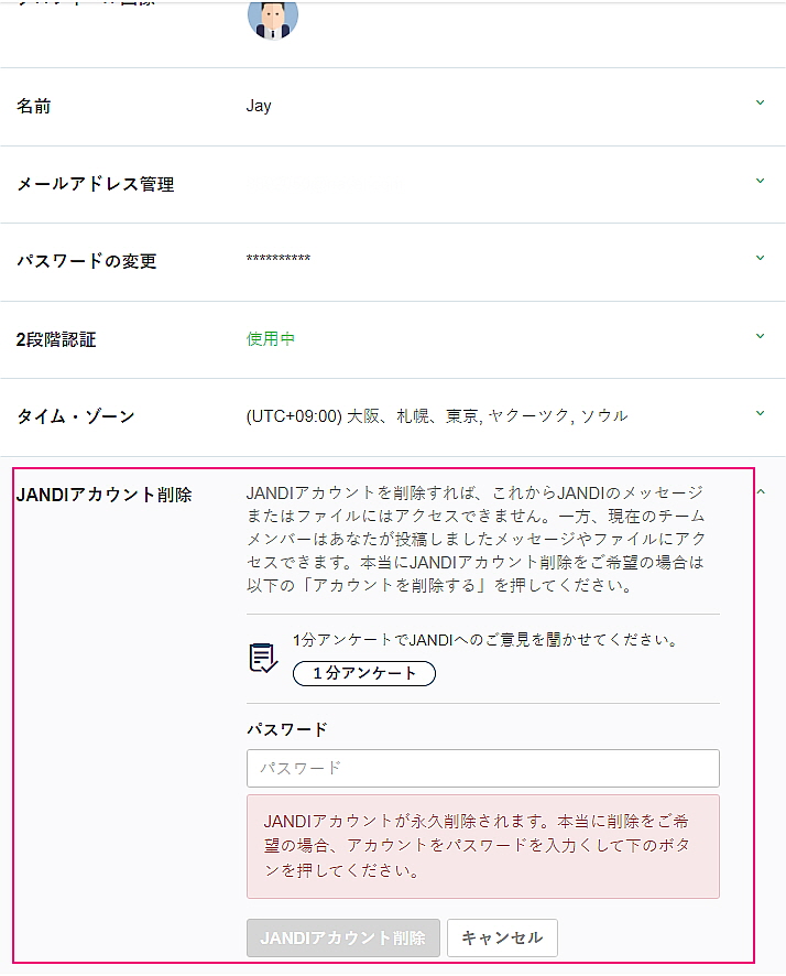 2. [JANDIアカウント削除]メニュをクリック、パスワードを入力しJANDIのアカウントを削除します。