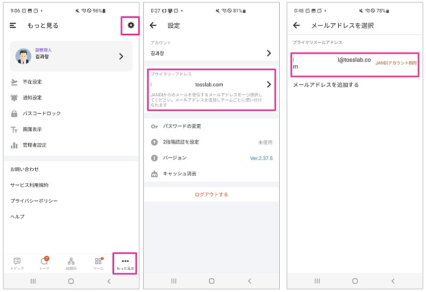 [Mobile]モバイルでは下部の[☰]もっと見る>右上の[設定]>[基本Eメール]>JANDIアカウント削除から設定できます。