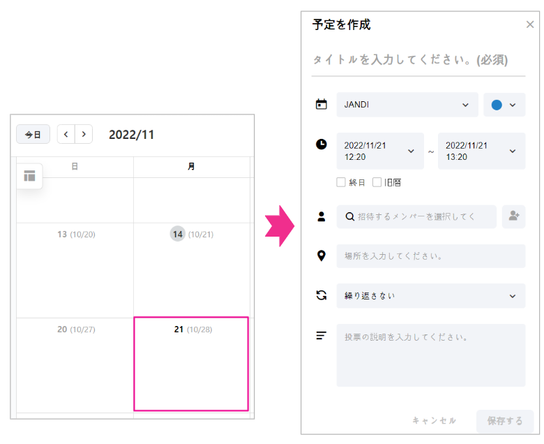 JANDIカレンダーは外部サービスの連携を行わなくてもJANDIで予定管理をできる機能です。