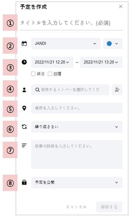 - 予定を公開:招待されていないメンバーにも予定の詳細内容を確認できます。