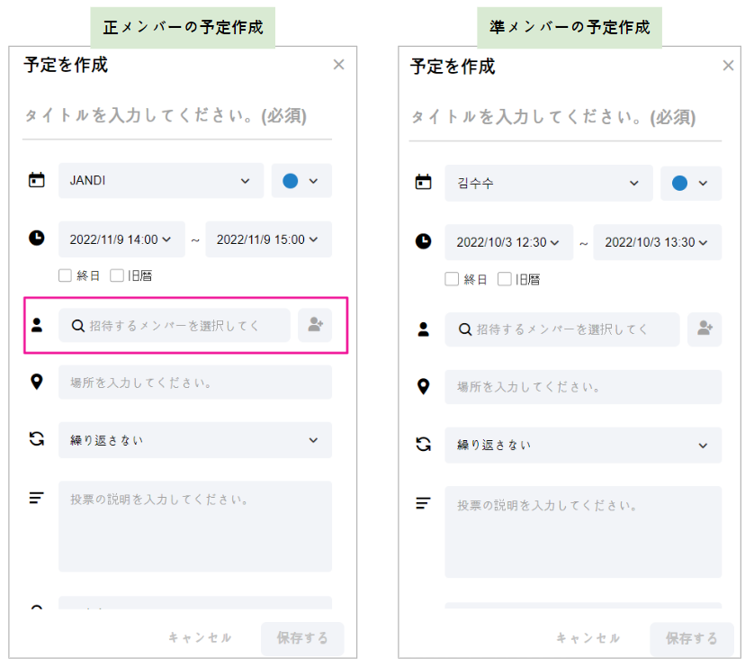 - 準メンバーは予定を作成する際に、参加者を招待できません。
