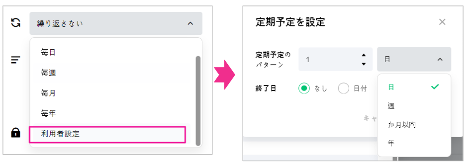 使用者設定を選択し、繰り返しのパターン、終了日時など設定できます。