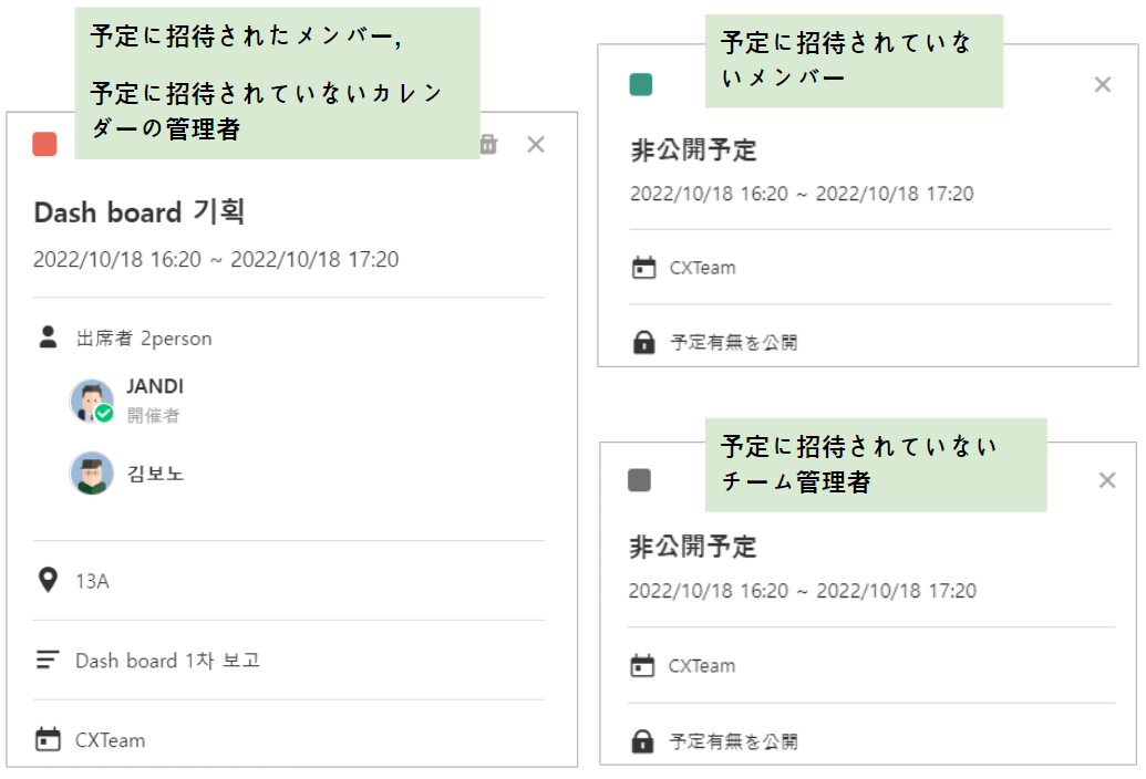 - 予定の有無を公開:予定に招待されていないメンバーと管理者には非公開予定で表示されます。 予定に招待されたメンバーとカレンダー管理者は詳細内容を閲覧できます。