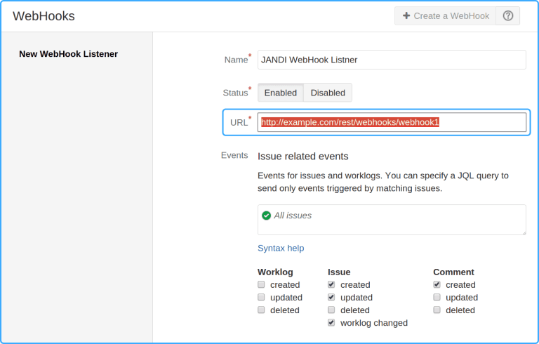 3.JIRAサービスSystem > WebHook項目で新しいWebHookを作成します。通知をもらうイベントリストを選択し、コネクト設定ウィンドウのWebHookをコピーしてペーストしてください。