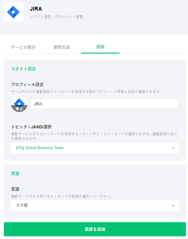 4.[Create]ボタンをクリックして設定を保存した後、JANDIコネクト設定画面で通知をもらうトピックまたはトークを選択します。 5.通知をもらう項目を選択します。 6.JANDIコネクトメッセージをもらう時見えるプロフィールと言語を変更できます。 7.設定が完了されると、設定を保存してJANDIコネクトを活性化します。 8.設定事項はいつでも変更できます。