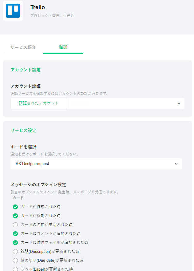 3.‘Trelloアカウント認証する’を選択し、連携させるアカウントでログインします。認証ウィンドウで‘許可’を選択してください。 4.JANDIコネクト設定ウィンドウで連携させるボードと通知をもらうトピックまたはトークを選択します。 5.通知をもらう項目を選択します。 6.JANDIコネクトメッセージをもらう時見えるプロフィールと言語を変更できます。 7.設定が完了されると、設定を保存してJANDIコネクトを活性化します。 8.設定事項はいつでも変更できます。