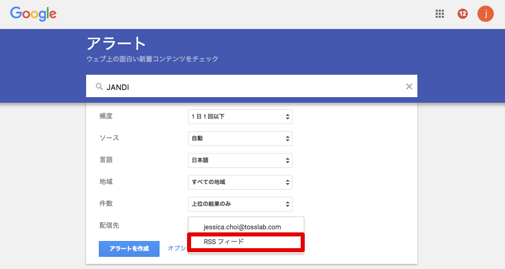 JANDIコネクトでRSS項目を連携させると業務に役に立つニュース記事をJANDIメッセージでもらうことができます。 ⒈RSSアドレスを準備します。 1-1.新聞社WebサイトのRSSをコピーする RSSフィードとは新しいコンテンツが様々に消費されるよう同じ規約で続いてアップデートされるWebアドレスです。一般的に新聞社またはブログは自分のコンテンツデータを伝送するRSSアドレスを提供します。新聞社またはブログのRSSアイコンを右クリックしてリンクをコピーします。 ご参考!新聞社のホームページアドレスがRSSアドレスではありません。直接新聞社のwebサイトアドレスを使うとエラーメッセージが起こります。または簡単な検索だけで有名な新聞社のRSSアドレスを得ることができます。 1-2.グーグルアラートRSS使用する(キーワード検索結果を常時JANDIメッセージでもらう) グーグルアラートはGoogle検索で特定のトピックについて新しい検索結果が見つかったときEメールまたはRSSで関連情報を受け取れるサービスです。 グーグルアラートで特定キーワード(例:自社の社名または製品名)を入力して受信位置をRSSフィードに変更します。