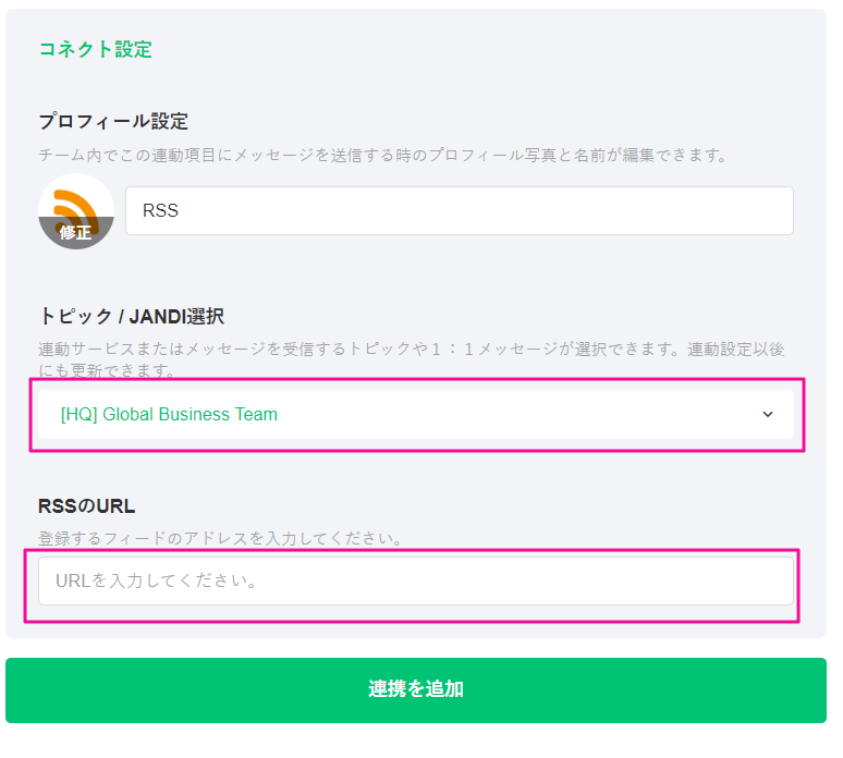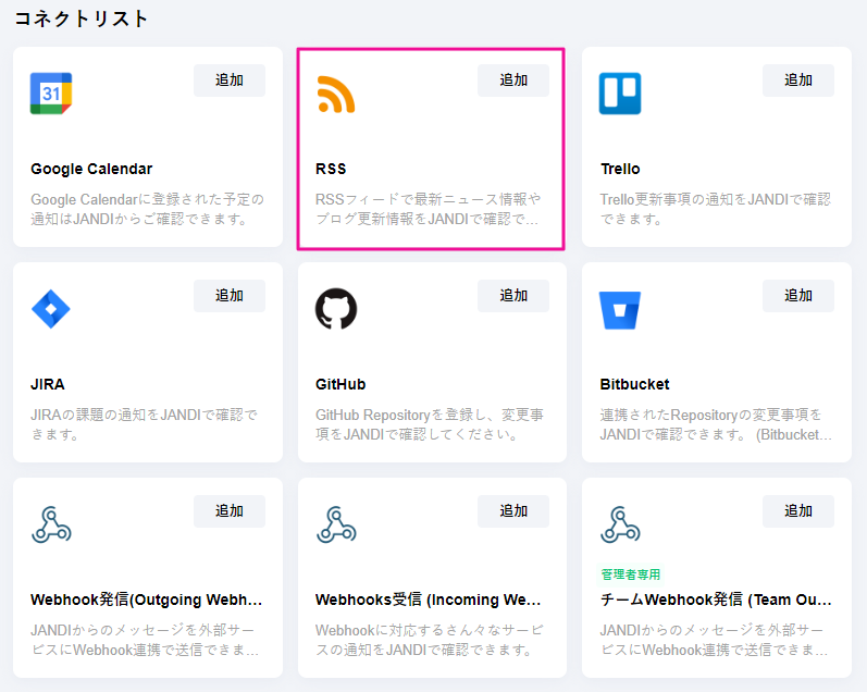 変更内容を保存するとリストにRSSアイコンが現れます。このアイコンを右クリックし’リンクコピー’をすると成功的にRSSアドレスをコピーできます。 2.JANDIコネクトでRSS連携させる ーJANDIコネクトでRSS連携を追加します。