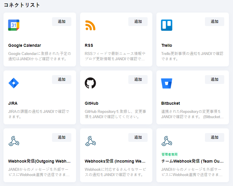 * JANDIコネクト(JANDI Connect) は他サービスをJANDIに連結してメッセージ通知をもらう機能です。 色んなサービスを同時に実行する必要なく、JANDIですぐよく使うサービスに移動でき便利です。 現在Bitbucket、Googleカレンダー、JIRA、GitHub、Trello5つのサービスと特定データをJANDIに伝送できるRSS、インカミングウェブフーク(Incoming Webhook)、アウトゴーイング・ウェブフーク(Outgoing Webhook)を連携できます。 <JANDIコネクト実行方法> 1.PC/Web画面左上[☰]ー[JANDIコネクト]メニューをクリックしたり、トピックウィンドウ右上プラグ型の[JANDIコネクト]ボタンをクリックします。