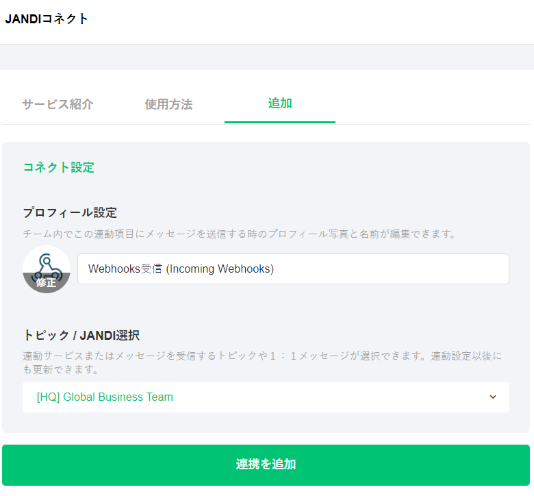 プロフィールイメージは名前の変更をご希望の場合JANDIコネクト修正画面ですぐ修正できます。 Tip! お客様がご使用するサービスの中で、ウェブフークを支援するサービスがあるとしても該当サービスで発生するイベントをJANDIがメッセージで構成できるフォーマットに毎度転換させないと正常的な受信ができません。この役割をするプロセスを直接開発することもありますが、Zapierのようなサードパーティサービスを通して設定ができます。 JANDIで表示できるメッセージの最大文字数は5000字で、ウェブフークで受信できる最大データストレージは256kbです。256kbは26万文字を超える大きさでとして一般的に使うには十分ですが、この以上のデータを受信するとエーラーメッセージを変換します。具体的には、25万文字くらいのメッセージをウェブフークで発送した時、5000字まで表示されます。 もし27万文字を発送するとメッセージ自体が発生できません。 またご不明な点やご意見がございましたらJANDIヘルプセンターよりお問い合わせください。