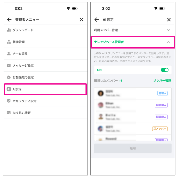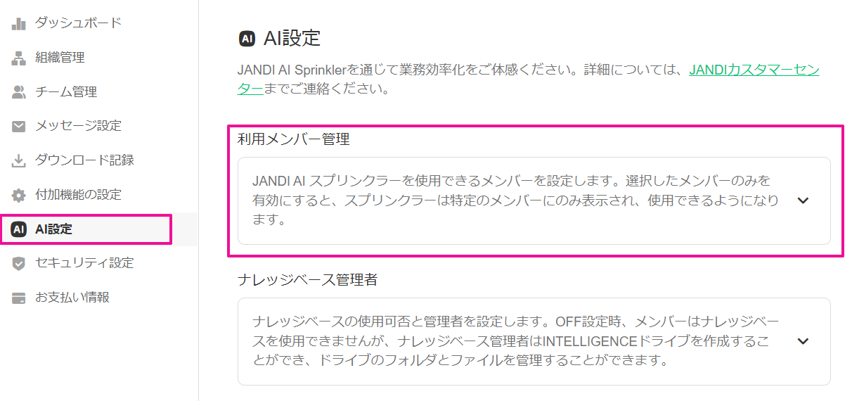 チーム内の所有者または管理者メンバーが、JANDI AI スプリンクラーを使用できるメンバーを設定できます。
