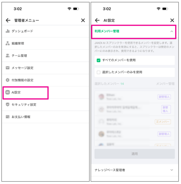 2. [AI設定] > [利用メンバー管理]で使用メンバーを選択できます。