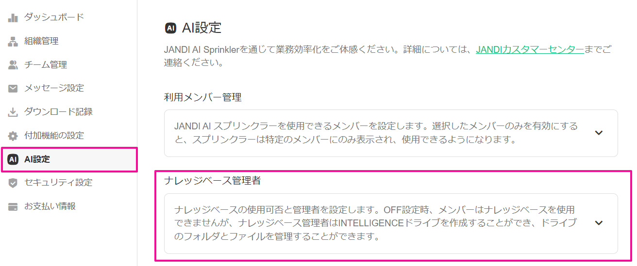 2. [AI設定] > [ナレッジベース管理者]で使用メンバーを選択できます。