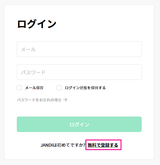 個人メールで登録中に [このメールアドレスは既に使用されています] と表示された場合、過去にJANDIへ登録された履歴がある可能性があります。ログイン画面の [パスワードをお忘れですか?] よりパスワードを再設定し、ログインをお試しください。