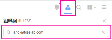 PCの場合:右上の [組織図] → [検索ボックス] にメールアドレスを入力