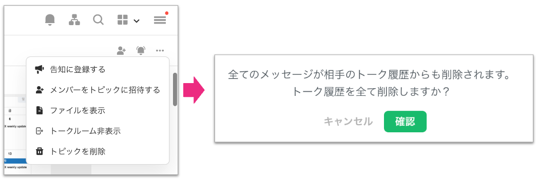 1:1トークを削除した際に、相手とのトークルームは全て削除され、ファイル、投票も全て削除されます。