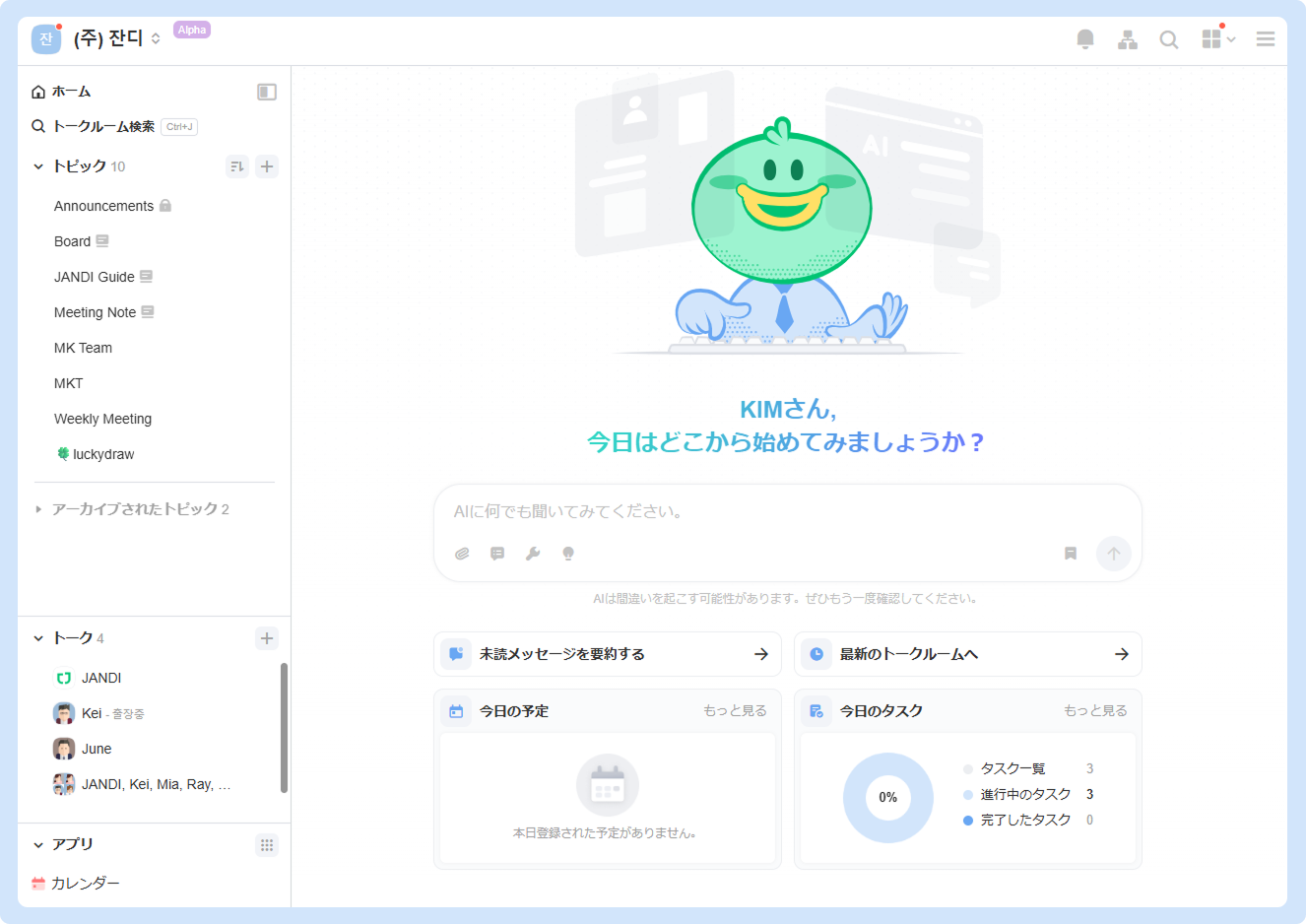 ホームでは、JANDI AIを無料で体験できます。Ask AIに直接質問を入力して利用したり、未読メッセージの要約で溜まったメッセージを確認できます。