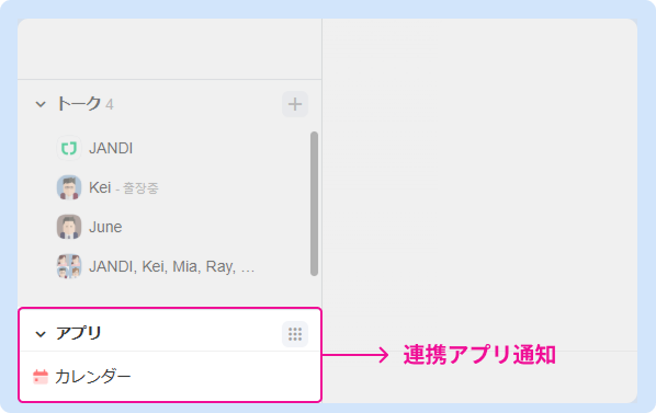 左下のアプリ領域では、連携されたアプリ(JANDIカレンダー、プロジェクトなど)からの通知を確認できます。