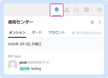 右上の通知センターでは、自分または所属部署へのメンション、ボードビューのトピック投稿、アカウントのログイン通知を確認できます。
