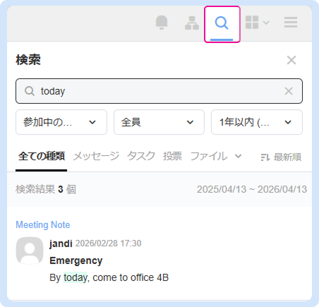 メッセージやファイルをキーワードで検索できます。