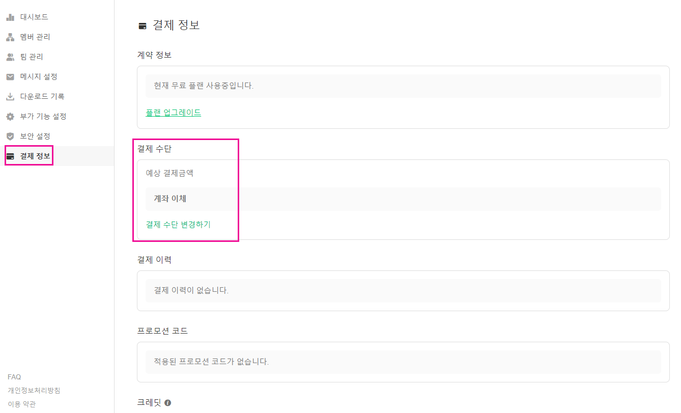 잔디 PC 화면 우측 상단에 위치한 [≡] 메뉴 아이콘을 클릭 - [관리자 메뉴] - [결제 정보] -[결제 수단 변경하기] 클릭 후 변경할 수 있습니다. *팀 관리자 또는 소유주만 [관리자 메뉴]에 접속할 수 있습니다. 📍결제 수단의 경우 PC에서만 등록/변경 가능합니다.