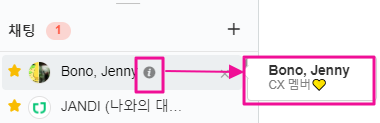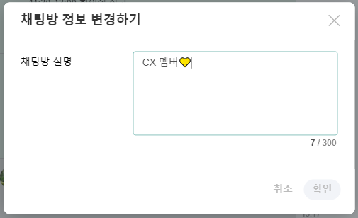 토픽에 토픽 설명이 가능한 것처럼, 그룹채팅의 경우에도 설명을 추가할 수 있습니다.동일한 멤버로 그룹채팅이 여러 개 생성이 되어 있다면 대화방이 헷갈릴 수 있기에 '채팅방 설명' 기능을 이용해 대화방을 표기해보세요.<그룹채팅 설명 예시>💻PC/Web1. 대화방 화면 우측 상단 [...] - [채팅방 설명] 메뉴를 클릭합니다.2. [채팅방 설명]에서 정보를 변경하실 수 있습니다.