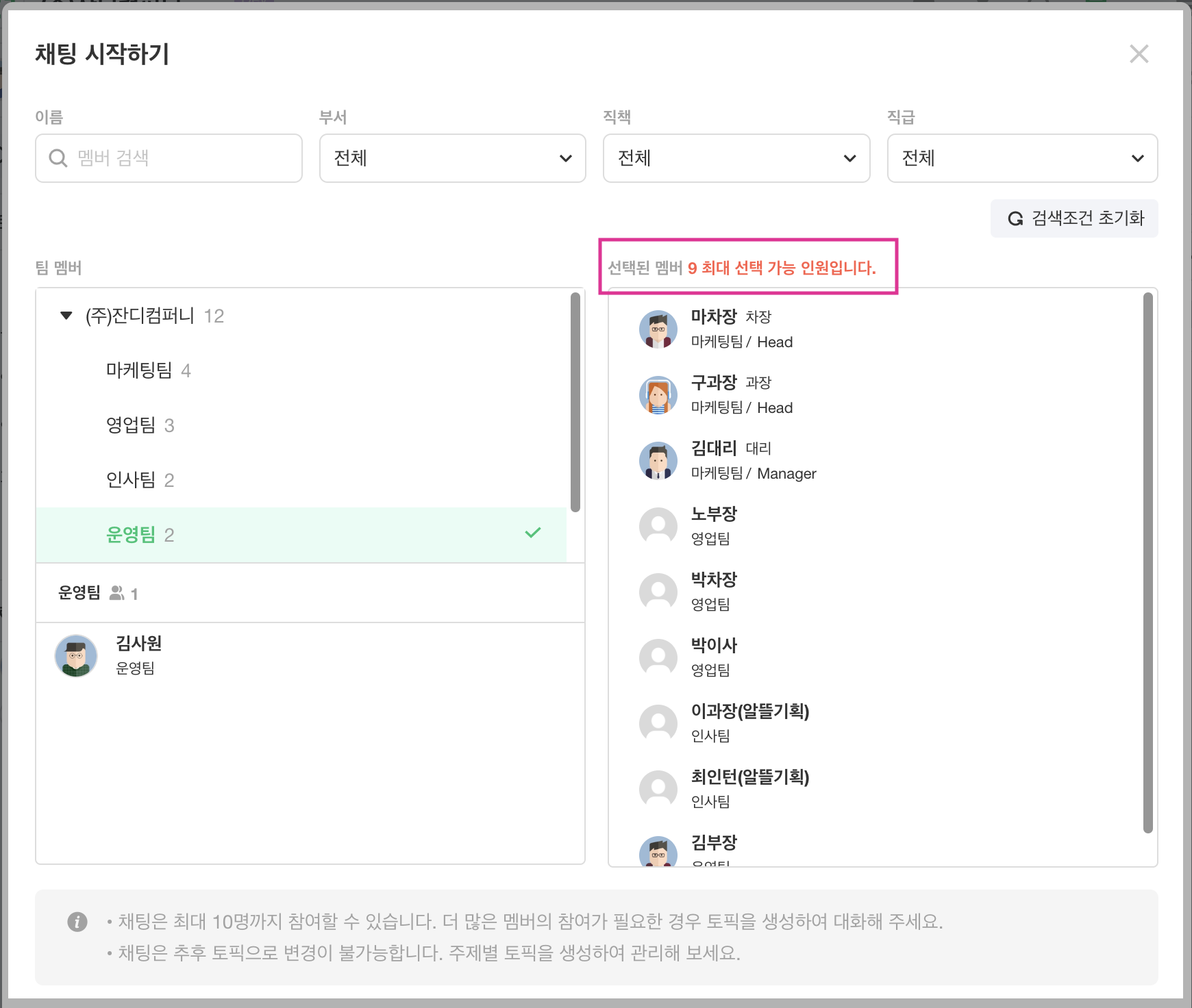 ✅ 채팅은 최대 인원이 10명이고, 토픽<->채팅 변경은 불가하기때문에 업무 관련 소통은 생산성을 높이기 위해 토픽 사용을 권장드려요.