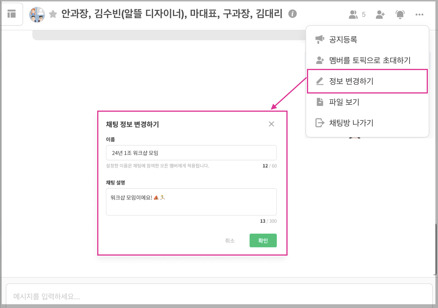 [정보 변경하기]를 통해 그룹 채팅 이름을 바꿀 수 있습니다.