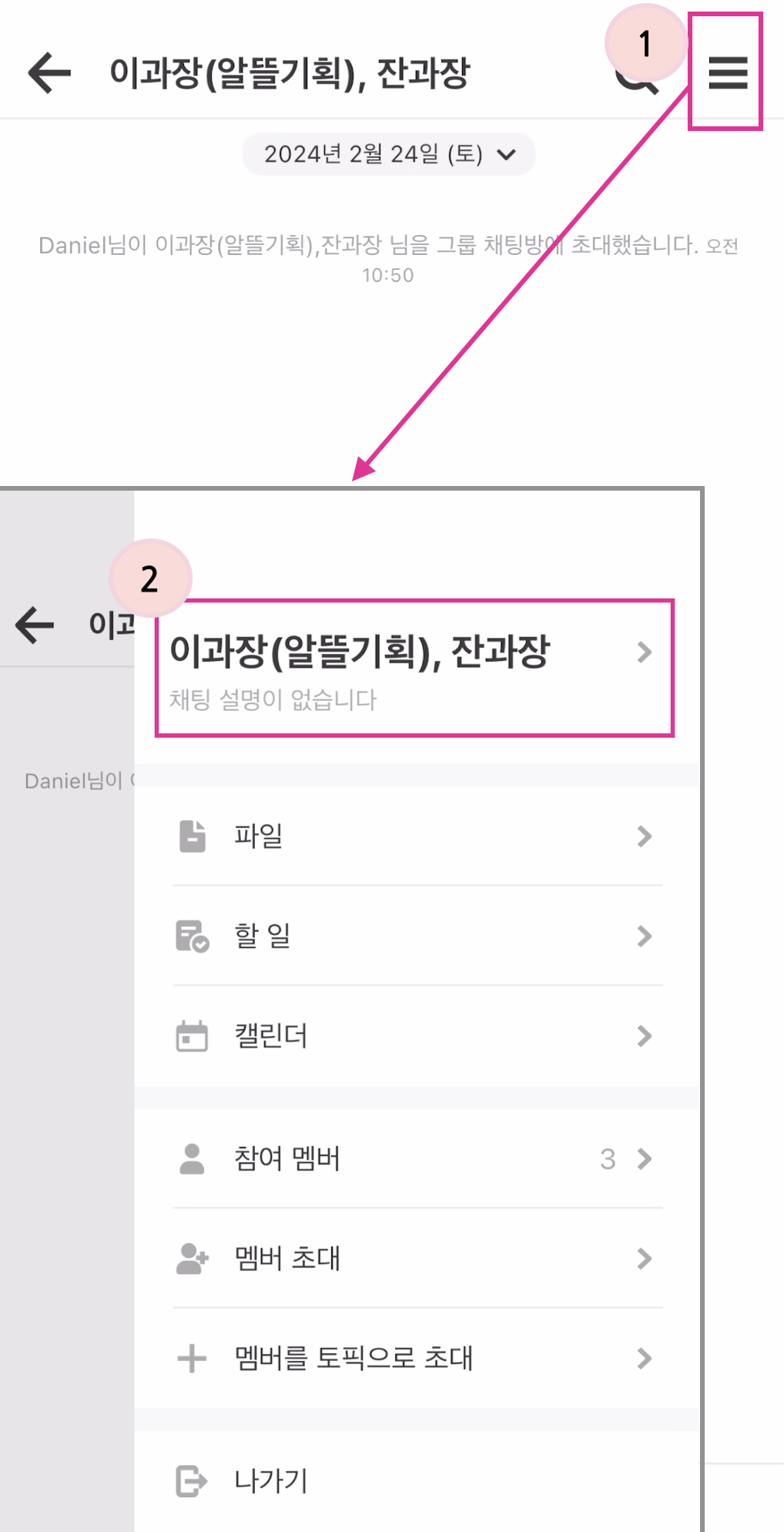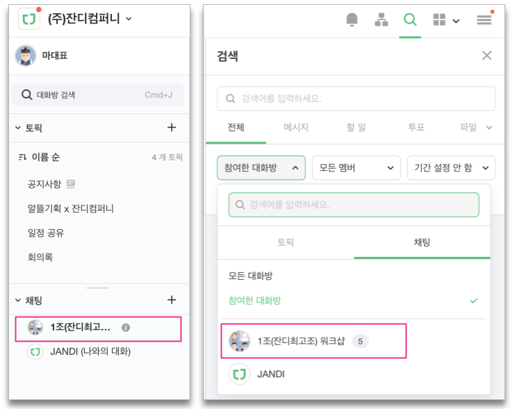✅ 채팅을 시작하기 전에 안내를 통해 토픽과 채팅 중 업무에 적합한 대화방을 참고할 수 있어요.