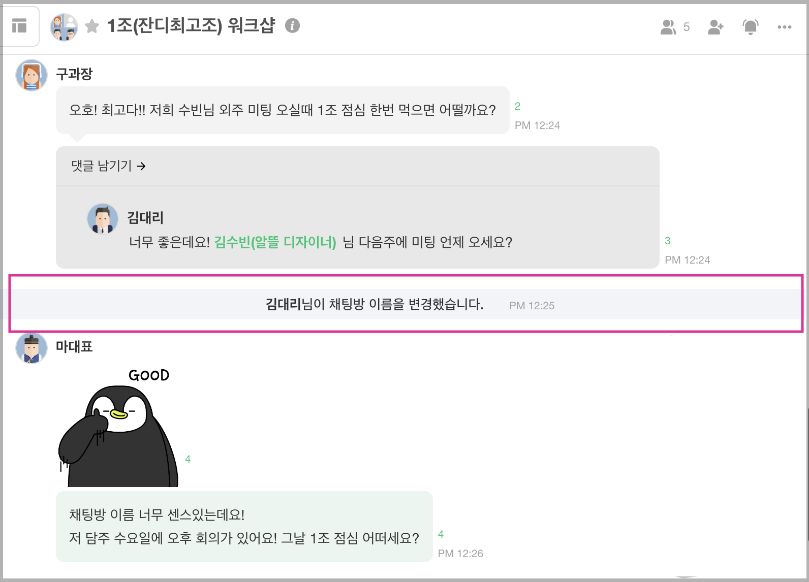 2. 변경된 이름은 그룹 채팅에 참여하고 있는 모든 멤버에게 일괄 적용되어요. 또한, 누가 이름을 변경했는지도 확인할 수 있습니다.