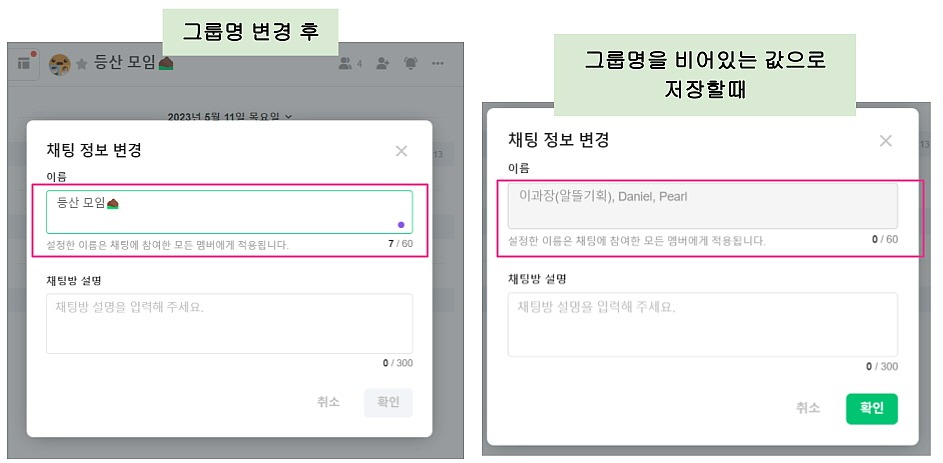 4. 그룹명 변경 후에 다시 그룹명을 비어있는 값으로 저장하면 수정 시점 참여 중인 멤버들의 이름 명으로 변경되어요.